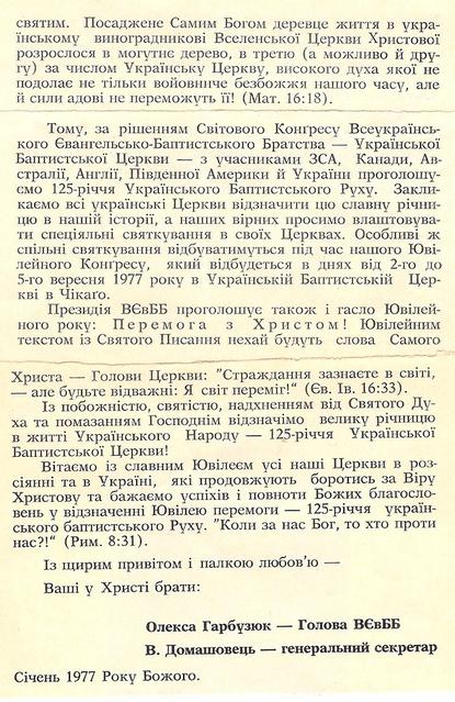 The 125th anniversary of the Baptist movement in Ukraine was celebrated with a special observance that was held at the Ukrainian Baptist Church of Chicago in 1977. The event was sponsored by the All-Ukrainian Evangelical Baptist Fellowship.